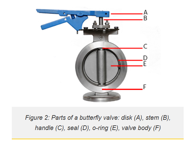 หลักการทำงานวาล์วผีเสื้อมีโครงสร้างที่ค่อนข้างง่าย รูปที่ 2 แสดงส่วนประกอบหลักของวาล์วปีกผีเสื้อ ซึ่งได้แก่ ตัววาล์ว ซีล ดิสก์ และก้าน แผ่นดิสก์ (รูปที่ 2 มีป้ายกำกับ E) ของวาล์วปีกผีเสื้ออยู่ในแนวเดียวกับศูนย์กลางของท่อที่เชื่อมต่อและก้าน (รูปที่ 2 มีป้ายกำกับ B) เชื่อมต่อกับแอคชูเอเตอร์หรือที่จับที่ด้านนอกของวาล์ว ในตำแหน่งปิด จานจะตั้งฉากกับการไหล ดังแสดงในรูปที่ 2 และซีลกับบ่าวาล์ว (รูปที่ 2 มีข้อความ D) โอริง (รูปที่ 2 มีป้ายกำกับ C) ในการบรรจุก้านซีลป้องกันการรั่วซึมตามแนวก้าน เมื่อแอคทูเอเตอร์หรือมือจับหมุนก้านวาล์วปีกผีเสื้อ 90° จานเบรกก็จะหมุน 90° เพื่อให้ขนานกับการไหล การหมุนบางส่วนช่วยให้การไหลถูกควบคุมหรือเป็นสัดส่วน